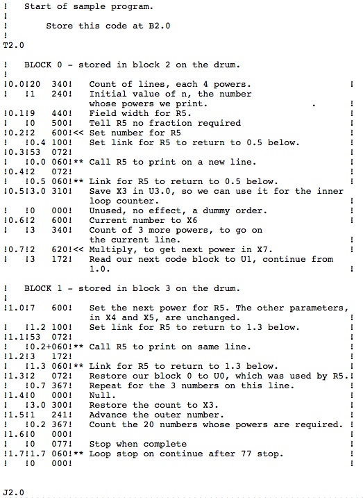 This was typed into a plain text editor, then processed to make a .TAP file for Chris Burton's simulator. The intention is to replicate the way we used to write programs for the Pegasus (see this example). The left hand column is the computing store address in which each instruction is executed, the right hand column is commentary, and the middle column specifies the instructions read onto the drum by Initial Orders. The pre-processor simply discards everything between pairs of shrieks.